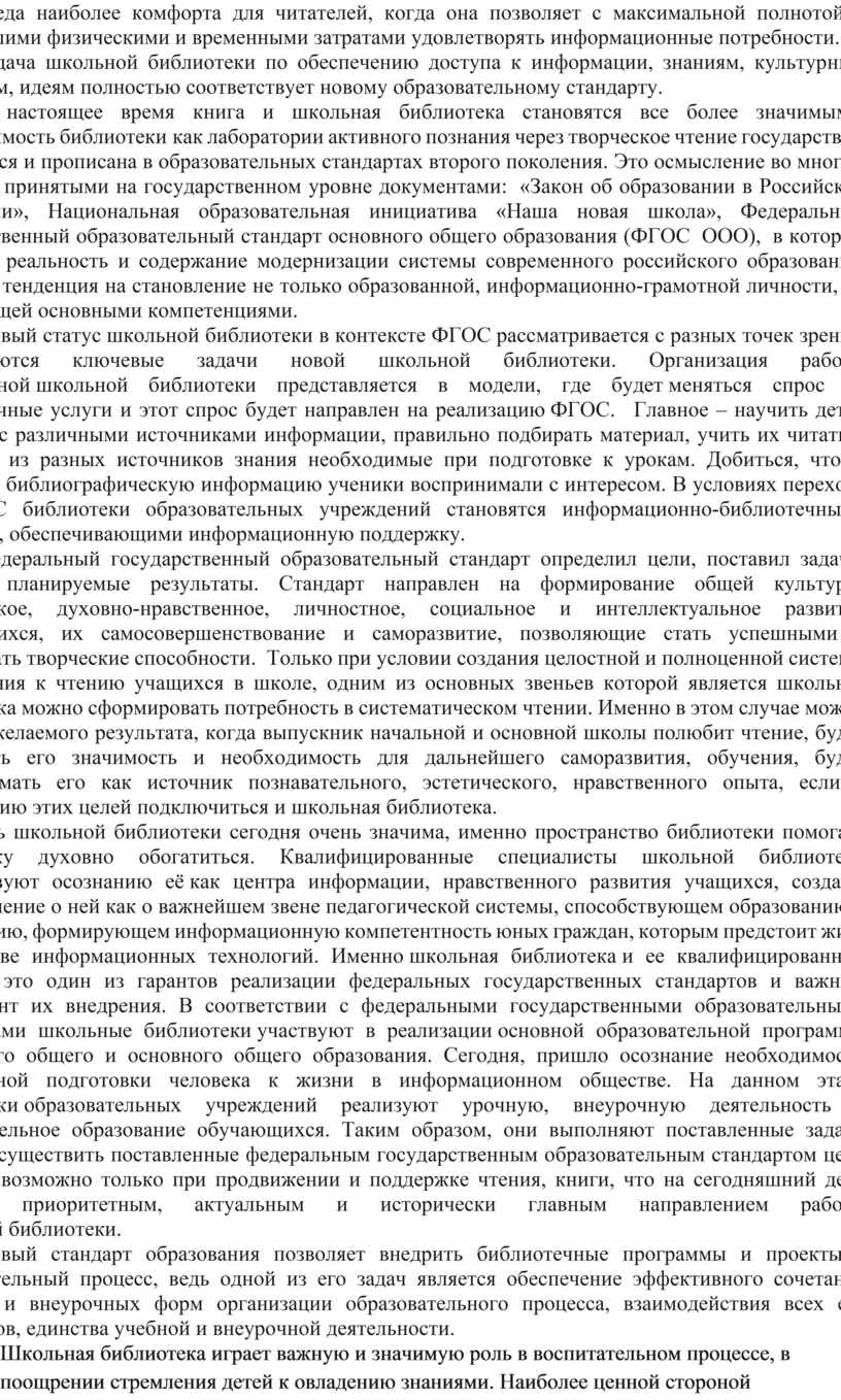 Федеральный государственный образовательный стандарт определил цели, поставил задачи, наметил планируемые результаты. Стандарт направлен на формирование общей культуры, гражданское, духовно-нравственное, личностное, социальное и интеллектуальное развитие обучающихся, их самосовершенствование и саморазвитие, позволяющие стать успешными и реализовать творческие способности. Только при условии создания целостной и полноценной системы приобщения к чтению учащихся в школе, одним из основных звеньев которой является школьная библиотека можно сформировать потребность в систематическом чтении. Именно в этом случае можно достичь желаемого результата, когда выпускник начальной и основной школы полюбит чтение, будет осознавать его значимость и необходимость для дальнейшего саморазвития, обучения, будет воспринимать его как источник познавательного, эстетического, нравственного опыта, если к достижению этих целей подключиться и школьная библиотека.