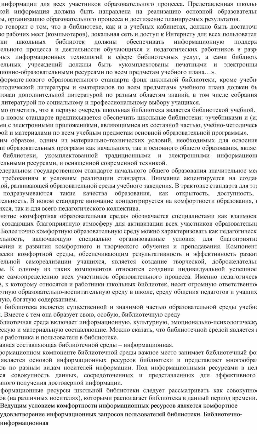 Понятие «комфортная образовательная среда» обозначается специалистами как взаимосвязь аспектов, создающих благоприятную атмосферу для активизации всех участников образовательного процесса. Более точно комфортную образовательную среду можно характеризовать как педагогическую действительность, включающую специально организованные условия для благоприятного формирования и развития комфортного и творческого обучения и преподавания. Компонентом педагогически комфортной среды, обеспечивающим результативность и эффективность развития образовательной самореализации учащихся, является создание творческой, доброжелательной атмосферы. К одному из таких компонентов относится создание индивидуальной успешности, содействие самоопределению всех участников образовательного процесса. Именно педагогический коллектив, к которому относятся и работники школьных библиотек, несет огромную ответственность за комфортную образовательно-воспитательную среду в школе, среду общения педагогов и учащихся, насыщенную, богатую содержанием.