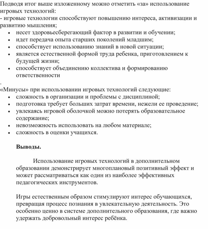 Использование игровых технологий в дополнительном образовании демонстрирует многоплановый позитивный эффект и может рассматриваться как один из наиболее эффективных педагогических инструментов.