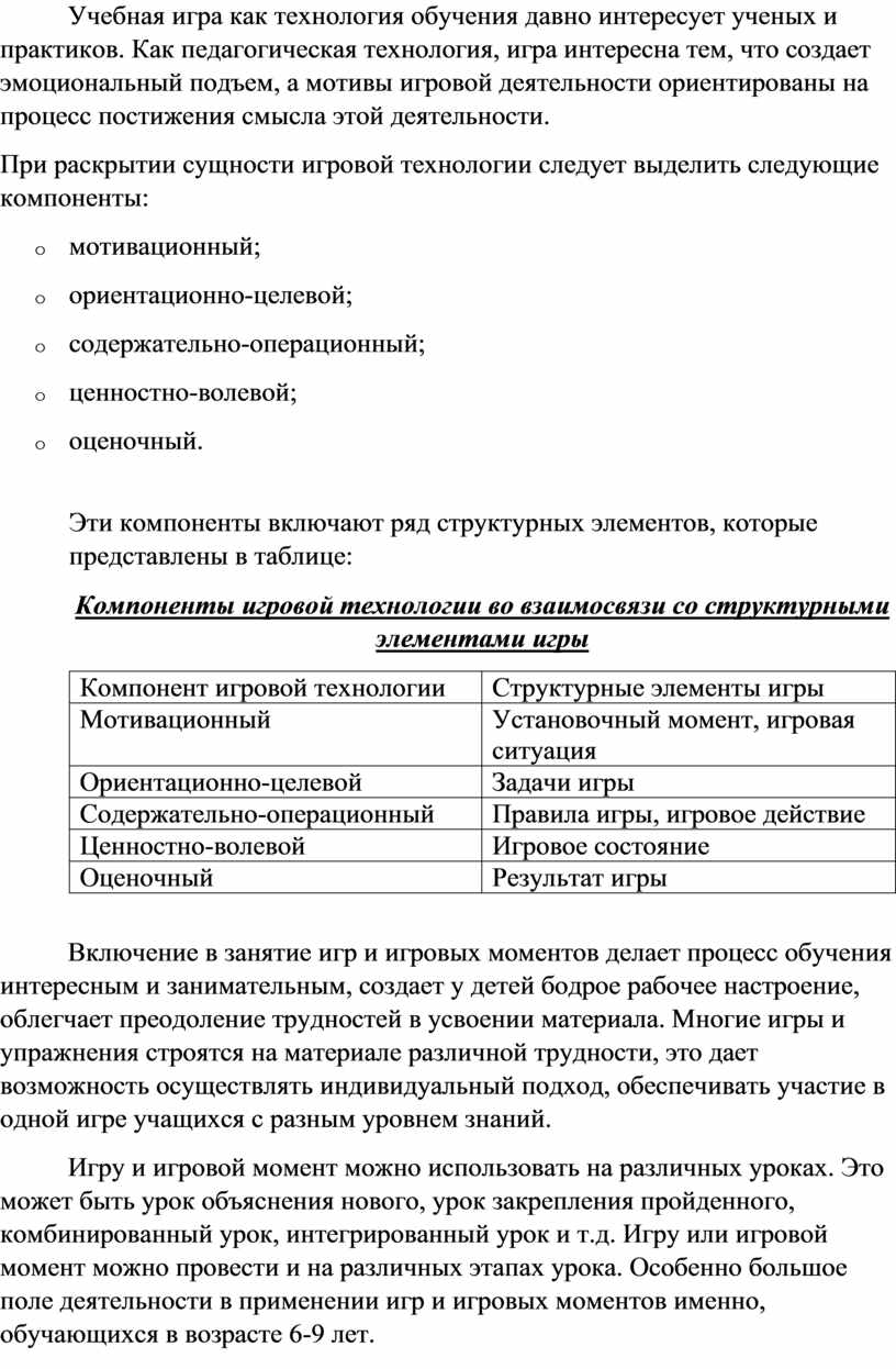 При раскрытии сущности игровой технологии следует выделить следующие компоненты: