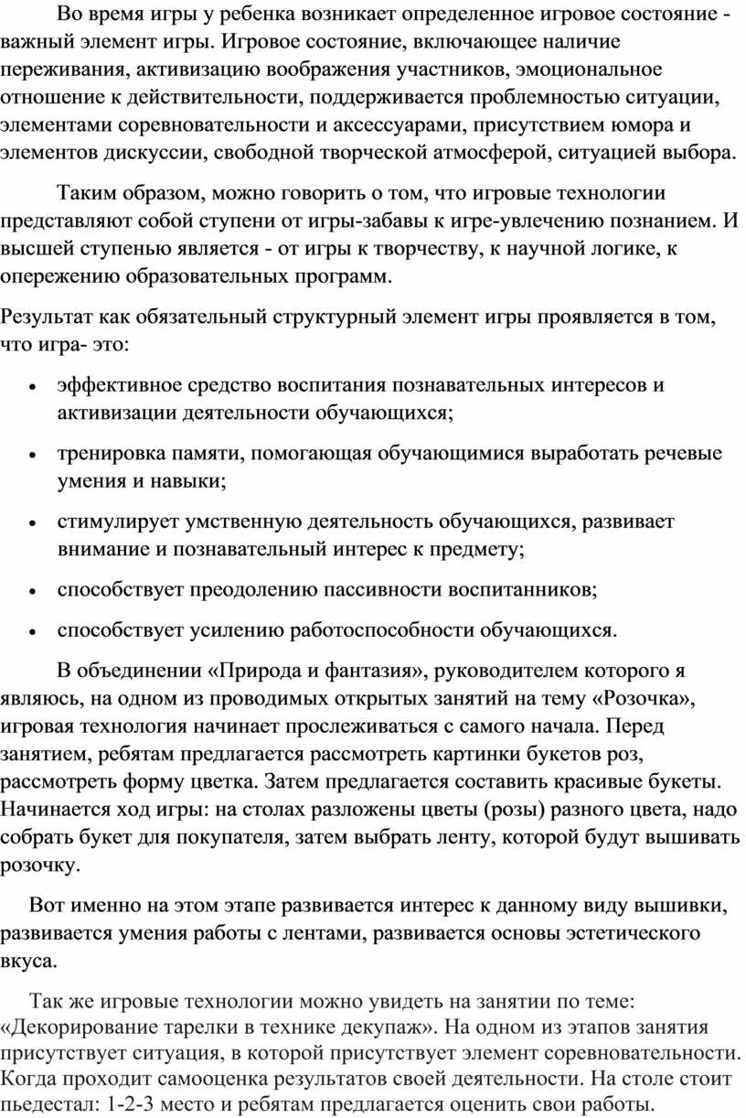В объединении «Природа и фантазия», руководителем которого я являюсь, на одном из проводимых открытых занятий на тему «Розочка», игровая технология начинает прослеживаться с самого начала. Перед занятием, ребятам предлагается рассмотреть картинки букетов роз, рассмотреть форму цветка. Затем предлагается составить красивые букеты. Начинается ход игры: на столах разложены цветы (розы) разного цвета, надо собрать букет для покупателя, затем выбрать ленту, которой будут вышивать розочку.