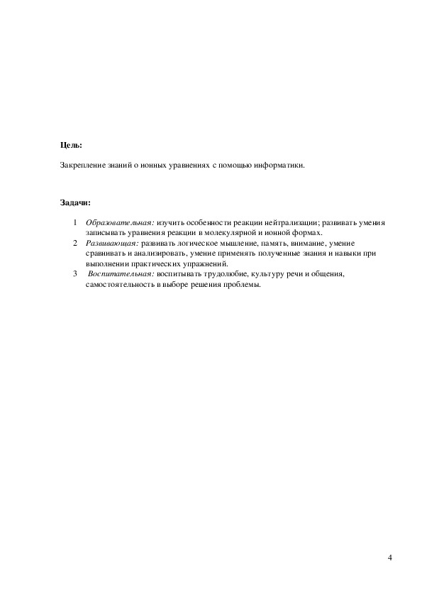 1 Образовательная: изучить особенности реакции нейтрализации; развивать умения