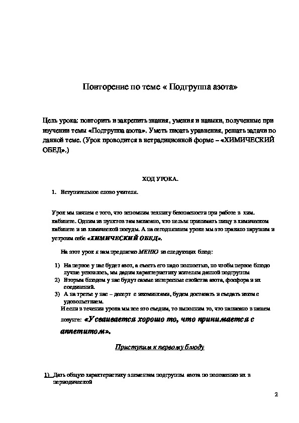 Цель урока: повторить и закрепить знания, умения и навыки, полученные при изучении темы «Подгруппа азота». Уметь писать уравнения, решать задачи по данной теме. (Урок проводится в нетрадиционной форме – «ХИМИЧЕСКИЙ ОБЕД».)