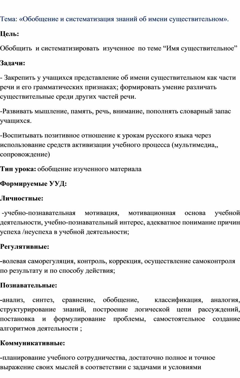 Тема: «Обобщение и систематизация знаний об имени существительном».