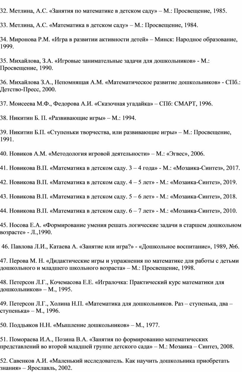 32. Метлина, А.С. «Занятия по математике в детском саду» – М.: Просвещение, 1985.