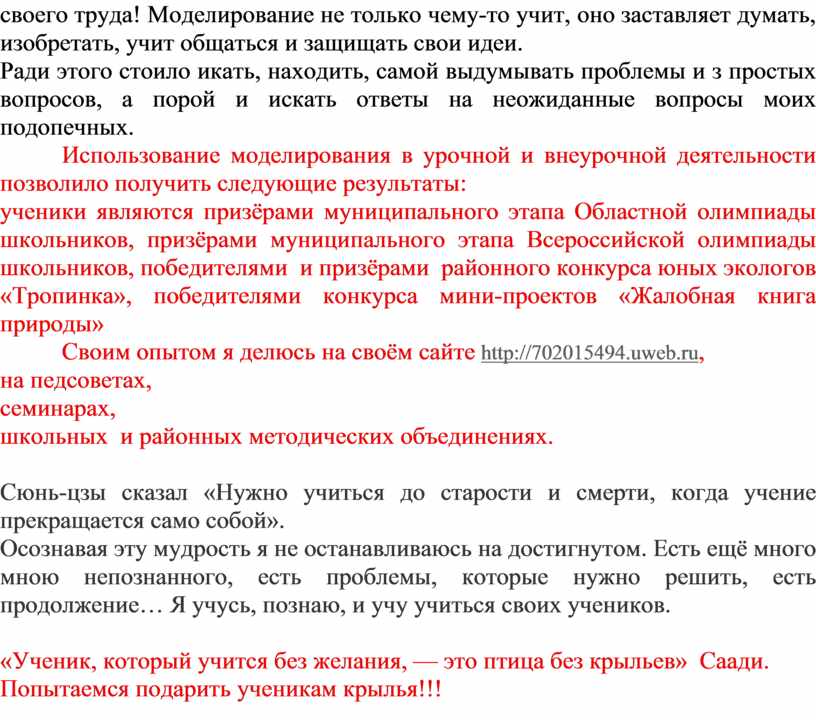 Осознавая эту мудрость я не останавливаюсь на достигнутом. Есть ещё много мною непознанного, есть проблемы, которые нужно решить, есть продолжение… Я учусь, познаю, и учу учиться своих учеников.