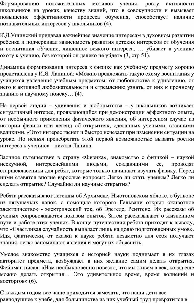 Нужно попытаться стать для учеников другом, «попутчиком» на их нелегком пути в мир физики, раскрывая сущность предмета, ненавязчиво создавая у них представление о целостности научной картины мира. «Являясь основой научно-технического прогресса, физика показывает учащимся гуманистическую сущность научных знаний, подчеркивая их особую нравственную ценность…способствует воспитанию нравственной личности. Эта основная цель обучения может быть достигнута только тогда, когда в процессе обучения будет сформирован интерес к знаниям, т.к. только в этом случае можно достигнуть эффекта сопереживания, пробуждающего определенные нравственные чувства и суждения учащихся» (4, стр.3).