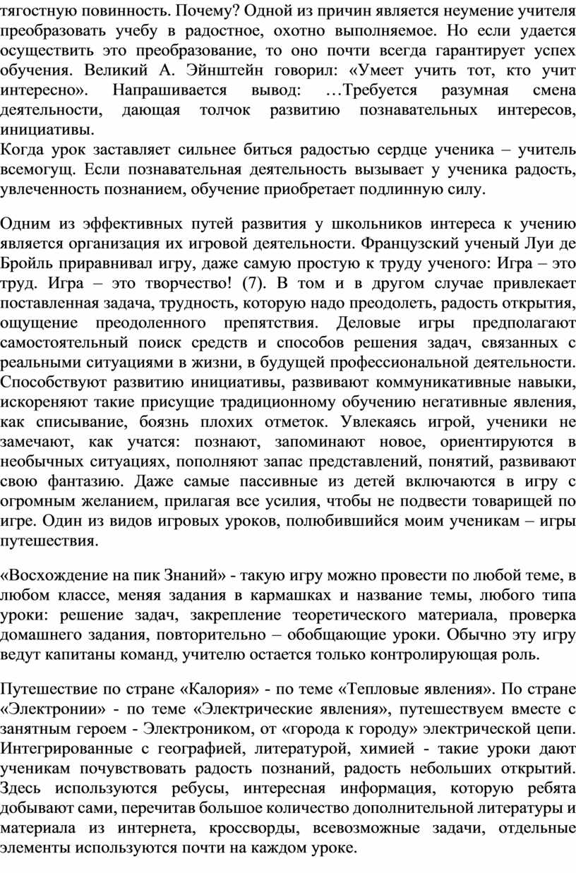 Путешествие по стране «Калория» - по теме «Тепловые явления». По стране «Электронии» - по теме «Электрические явления», путешествуем вместе с занятным героем - Электроником, от «города к городу» электрической цепи. Интегрированные с географией, литературой, химией - такие уроки дают ученикам почувствовать радость познаний, радость небольших открытий. Здесь используются ребусы, интересная информация, которую ребята добывают сами, перечитав большое количество дополнительной литературы и материала из интернета, кроссворды, всевозможные задачи, отдельные элементы используются почти на каждом уроке.