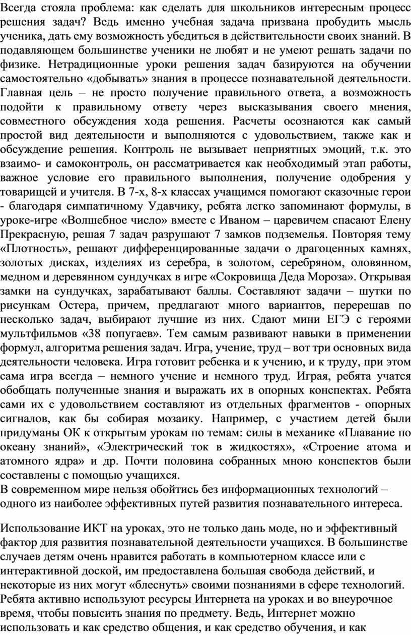 Всегда стояла проблема: как сделать для школьников интересным процесс решения задач? Ведь именно учебная задача призвана пробудить мысль ученика, дать ему возможность убедиться в действительности своих знаний. В подавляющем большинстве ученики не любят и не умеют решать задачи по физике. Нетрадиционные уроки решения задач базируются на обучении самостоятельно «добывать» знания в процессе познавательной деятельности. Главная цель – не просто получение правильного ответа, а возможность подойти к правильному ответу через высказывания своего мнения, совместного обсуждения хода решения. Расчеты осознаются как самый простой вид деятельности и выполняются с удовольствием, также как и обсуждение решения. Контроль не вызывает неприятных эмоций, т.к. это взаимо- и самоконтроль, он рассматривается как необходимый этап работы, важное условие его правильного выполнения, получение одобрения у товарищей и учителя. В 7-х, 8-х классах учащимся помогают сказочные герои - благодаря симпатичному Удавчику, ребята легко запоминают формулы, в уроке-игре «Волшебное число» вместе с Иваном – царевичем спасают Елену Прекрасную, решая 7 задач разрушают 7 замков подземелья. Повторяя тему «Плотность», решают дифференцированные задачи о драгоценных камнях, золотых дисках, изделиях из серебра, в золотом, серебряном, оловянном, медном и деревянном сундучках в игре «Сокровища Деда Мороза». Открывая замки на сундучках, зарабатывают баллы. Составляют задачи – шутки по рисункам Остера, причем, предлагают много вариантов, перерешав по несколько задач, выбирают лучшие из них. Сдают мини ЕГЭ с героями мультфильмов «38 попугаев». Тем самым развивают навыки в применении формул, алгоритма решения задач. Игра, учение, труд – вот три основных вида деятельности человека. Игра готовит ребенка и к учению, и к труду, при этом сама игра всегда – немного учение и немного труд. Играя, ребята учатся обобщать полученные знания и выражать их в опорных конспектах. Ребята сами их с удовольствием составляют из отдельных фрагментов - опорных сигналов, как бы собирая мозаику. Например, с участием детей были придуманы ОК к открытым урокам по темам: силы в механике «Плавание по океану знаний», «Электрический ток в жидкостях», «Строение атома и атомного ядра» и др. Почти половина собранных мною конспектов были составлены с помощью учащихся.