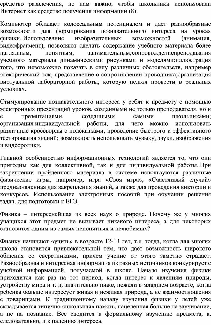 Компьютер обладает колоссальным потенциалом и даёт разнообразные возможности для формирования познавательного интереса на уроках физики. Использование изобразительных возможностей (анимация, видеофрагмент), позволяют сделать содержание учебного материала более наглядным, понятным, занимательным;сопровождениепреподавания учебного материала динамическими рисунками и моделями;иллюстрация того, что невозможно показать в силу различных обстоятельств, например электрический ток, представление о сопротивлении проводника;организация виртуальной лабораторной работы, которую нельзя провести в реальных условиях.