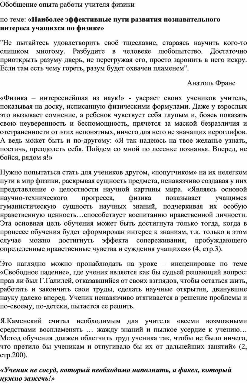 Обобщение опыта работы учителя физики