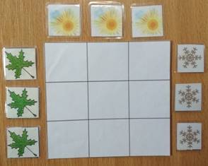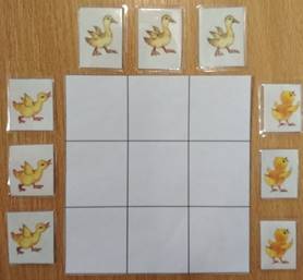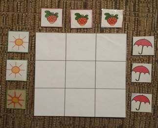 На занятиях по развитию познавательной деятельности, элементах арифметики начинала работу с несколькими одинаковыми группами множеств предметов на игровом поле 3х3 с почти заполненными клетками, оставляя 1 - 3 пустые, которые нужно заполнить (найти и положить соответствующую картинку либо дорисовать), используя правила и логику.