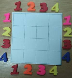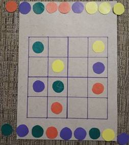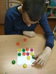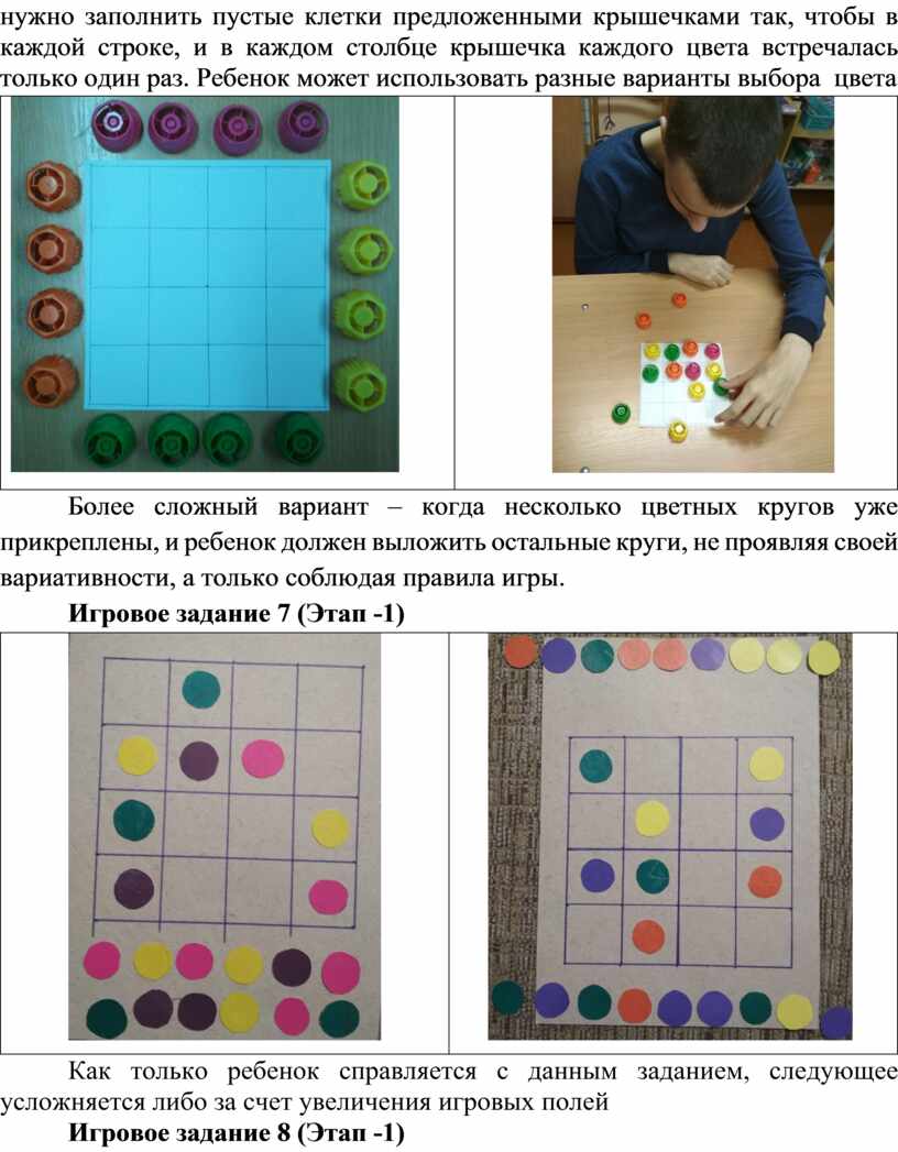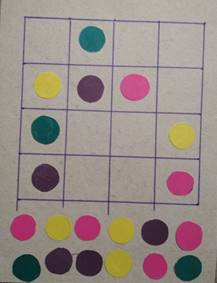 нужно заполнить пустые клетки предложенными крышечками так, чтобы в каждой строке, и в каждом столбце крышечка каждого цвета встречалась только один раз. Ребенок может использовать разные варианты выбора цвета