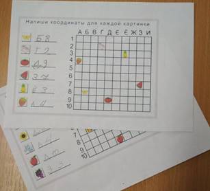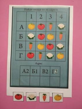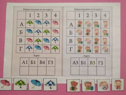 Предлагается игровое поле 4х4, заполненное картинками. По вертикали поле обозначено буквами А, Б, В, Г, по горизонтали – цифрами 1, 2, 3, 4. Работа происходит как бы в системе координат, выполняя совмещение по вертикали и горизонтали с использованием цифрового и буквенного обозначения – «адреса».