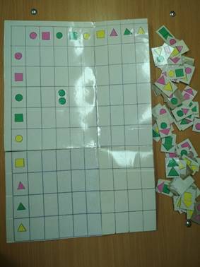 Множество заданий выполняется на установление простейших закономерностей: порядок чередования фигур по цвету, форме, размеру; игровые упражнения на нахождение пропущенной в ряду фигуры, нахождение пропущенной в квадратах 3Х3, 4Х4 фигуры.