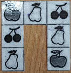 Когда дети научились справляться с этим заданием, можно предложить чистое игровое поле и 3 набора одинаковых предметов. Правила те же: