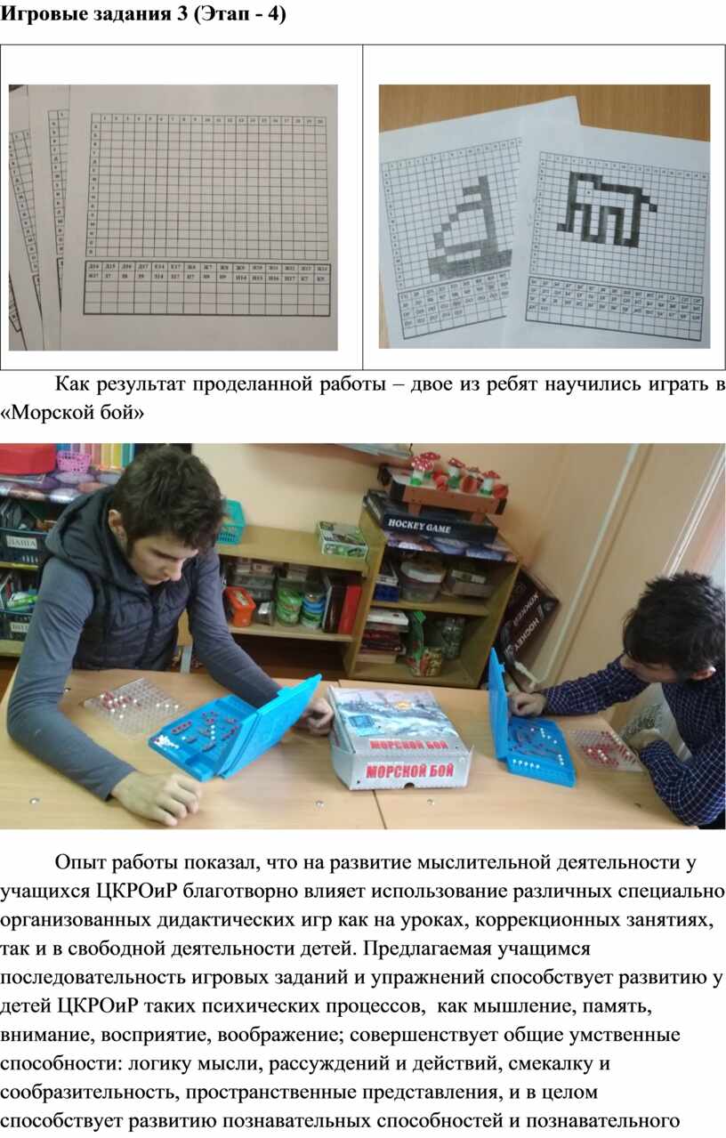 Предпосылкой возникновения моей работы послужило приобретение в класс игры «Морской бой», которой ребята очень заинтересовались, достаточно высокая познавательная активность некоторых учеников класса, анализ опыта работы с учащимися с интеллектуальной недостаточностью.