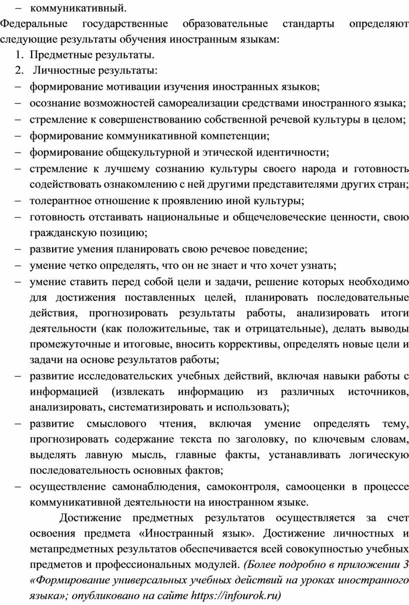 Достижение предметных результатов осуществляется за счет освоения предмета «Иностранный язык». Достижение личностных и метапредметных результатов обеспечивается всей совокупностью учебных предметов и профессиональных модулей. (Более подробно в приложении 3 «Формирование универсальных учебных действий на уроках иностранного языка»; опубликовано на сайте https://infourok.ru)