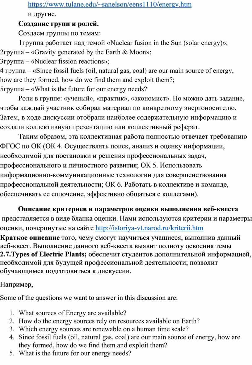 Краткое описание того, чему смогут научиться учащиеся, выполнив данный веб-квест. Выполнение данного веб-квеста выявит полноту освоения темы 2.7.Types of Electric Plants; обеспечит студентов дополнительной информацией, необходимой для будущей профессиональной деятельности; позволит обучающимся подготовиться к дискуссии.