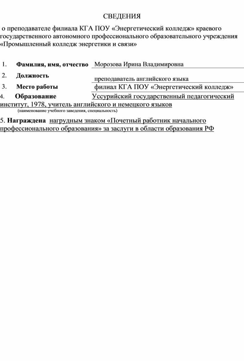 о преподавателе филиала КГА ПОУ «Энергетический колледж» краевого государственного автономного профессионального образовательного учреждения «Промышленный колледж энергетики и связи»