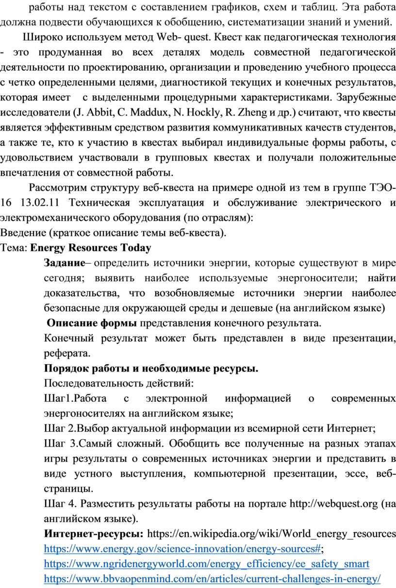 Рассмотрим структуру веб-квеста на примере одной из тем в группе ТЭО-16 13.02.11 Техническая эксплуатация и обслуживание электрического и электромеханического оборудования (по отраслям):