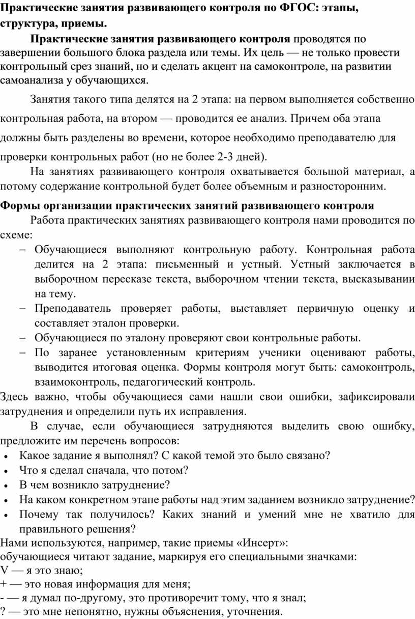 Практические занятия развивающего контроля по ФГОС: этапы, структура, приемы.