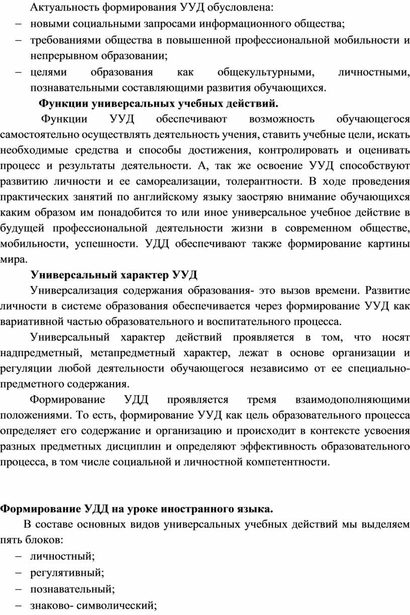 Функции УУД обеспечивают возможность обучающегося самостоятельно осуществлять деятельность учения, ставить учебные цели, искать необходимые средства и способы достижения, контролировать и оценивать процесс и результаты деятельности. А, так же освоение УУД способствуют развитию личности и ее самореализации, толерантности. В ходе проведения практических занятий по английскому языку заостряю внимание обучающихся каким образом им понадобится то или иное универсальное учебное действие в будущей профессиональной деятельности жизни в современном обществе, мобильности, успешности. УДД обеспечивают также формирование картины мира.