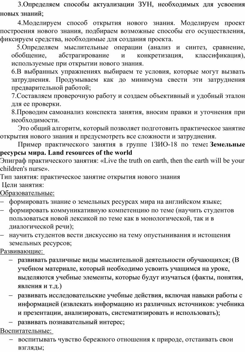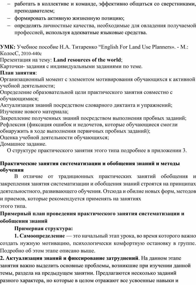 Примерный план проведения практического занятия систематизации и обобщения знаний
