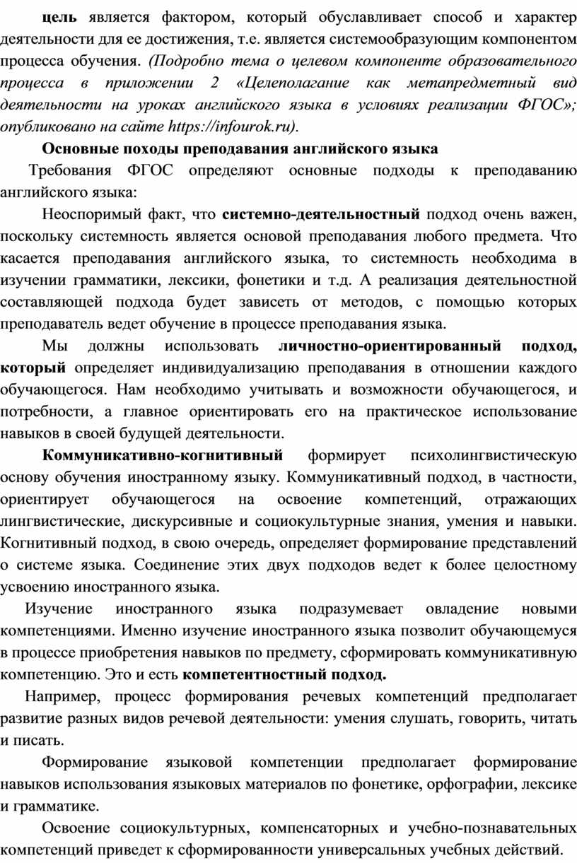 Таким образом, целеполагание в обучении - это установление преподавателем и обучающимися целей обучения на определённых его этапах, а цель является фактором, который обуславливает способ и характер деятельности для ее достижения, т.е. является системообразующим компонентом процесса обучения. (Подробно тема о целевом компоненте образовательного процесса в приложении 2 «Целеполагание как метапредметный вид деятельности на уроках английского языка в условиях реализации ФГОС»; опубликовано на сайте https://infourok.ru).