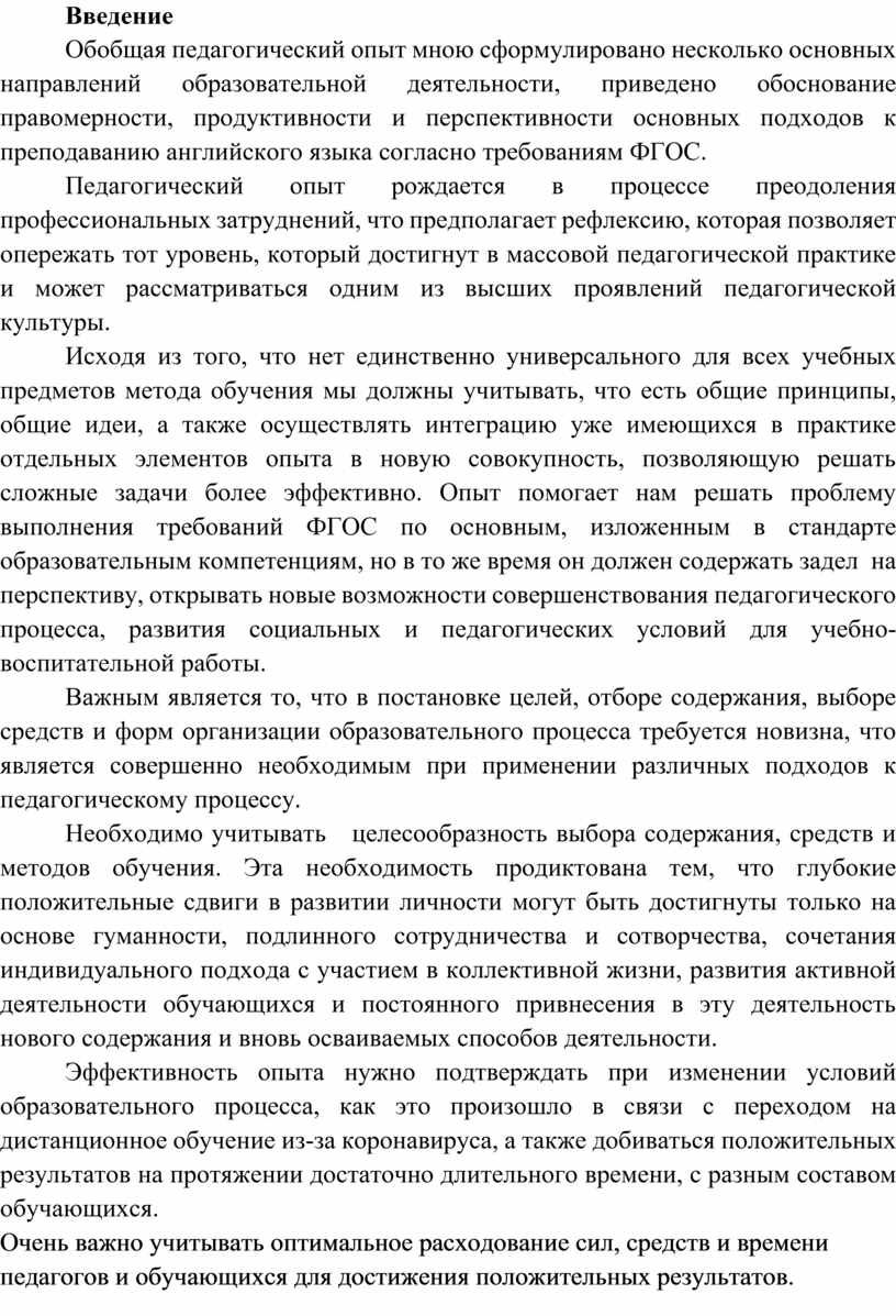 Обобщая педагогический опыт мною сформулировано несколько основных направлений образовательной деятельности, приведено обоснование правомерности, продуктивности и перспективности основных подходов к преподаванию английского языка согласно требованиям ФГОС.