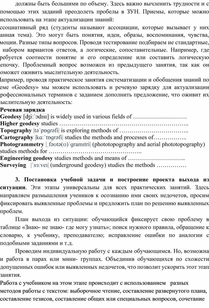Например, проводя практическое занятия систематизации и обобщения знаний по теме «Geodesy» мы можем использовать и речевую зарядку для актуализации профессиональных терминов с заданием дополнить предложение, что оживит их мыслительную деятельность: