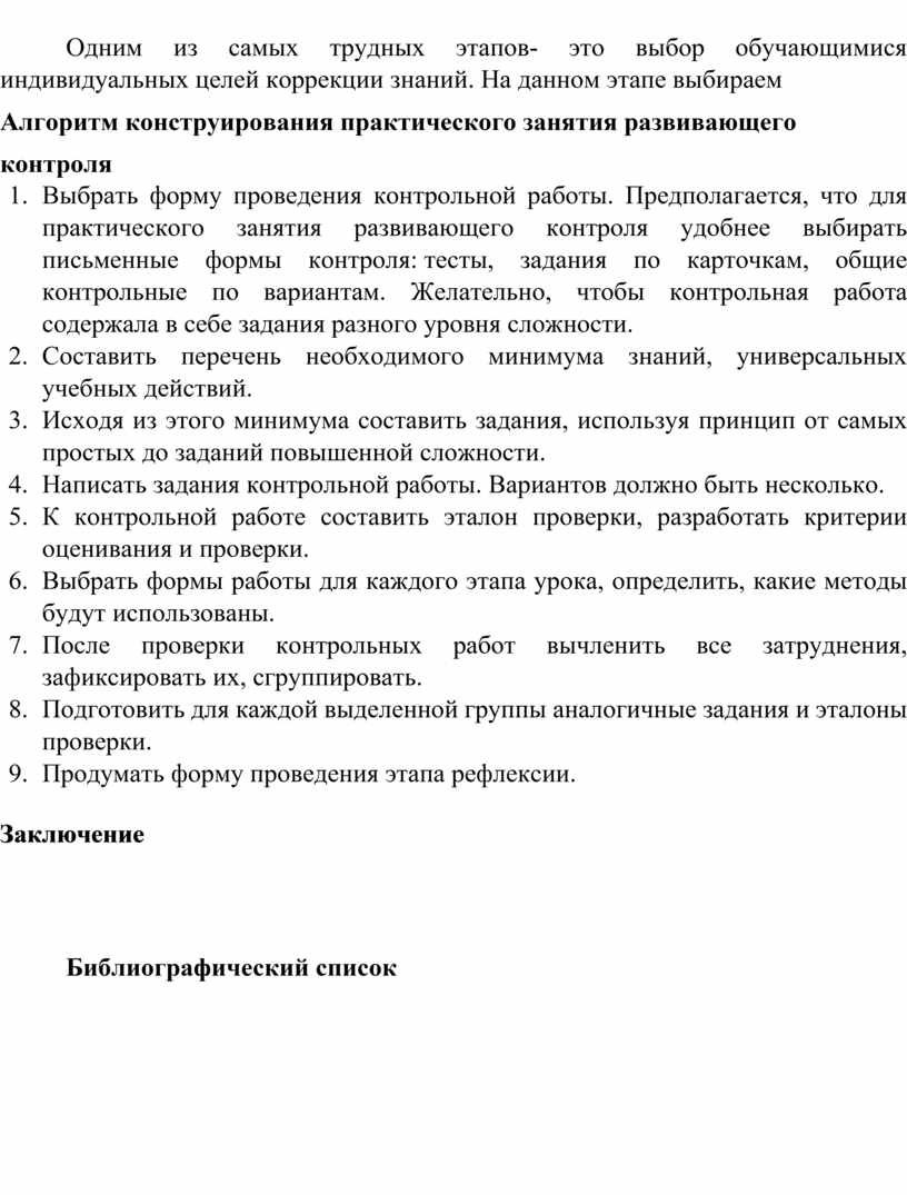 Практические занятия развивающего контроля проводятся по завершении большого блока раздела или темы. Их цель — не только провести контрольный срез знаний, но и сделать акцент на самоконтроле, на развитии самоанализа у обучающихся.