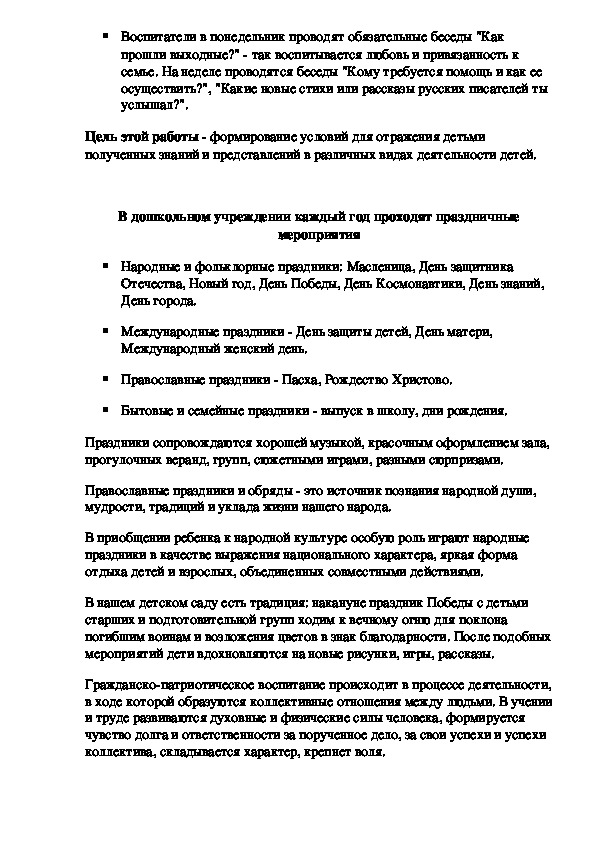 патриотические и фольклорные праздники; Воспитатели в понедельник проводят обязательные беседы "Как