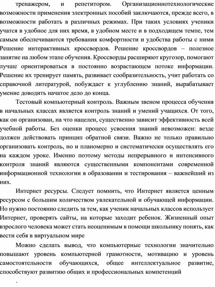 Можно сделать вывод, что компьютерные технологии значительно повышают уровень компьютерной грамотности, мотивацию и уровень самостоятельности обучающихся, общее интеллектуальное развитие, способствуют развитию общих и профессиональных компетенций