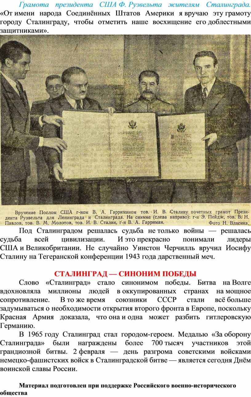 Грамота президента США Ф. Рузвельта жителям Сталинграда. «От имени народа Соединённых Штатов Америки я вручаю эту грамоту городу Сталинграду, чтобы отметить наше восхищение его доблестными защитниками».
