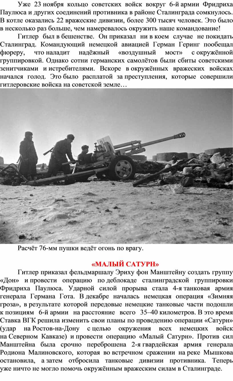 Гитлер приказал фельдмаршалу Эриху фон Манштейну создать группу «Дон» и провести операцию по деблокаде сталинградской группировки Фридриха Паулюса. Ударной силой прорыва стала 4-я танковая армия генерала Германа Гота. В декабре началась немецкая операция «Зимняя гроза», в результате которой передовые немецкие танковые части подошли к позициям 6-й армии на расстояние всего 35–40 километров. В это время Ставка ВГК решила изменить свои планы по проведению операции «Сатурн» (удар на Ростов-на-Дону с целью окружения всех немецких войск на Северном Кавказе) и провести операцию «Малый Сатурн». Против сил Манштейна была срочно переброшена 2-я гвардейская армия генерала Родиона Малиновского, которая во встречном сражении на реке Мышкова остановила, а затем отбросила танковые дивизии противника. Теперь уже ничто не могло помочь окружённым вражеским силам в Сталинграде.