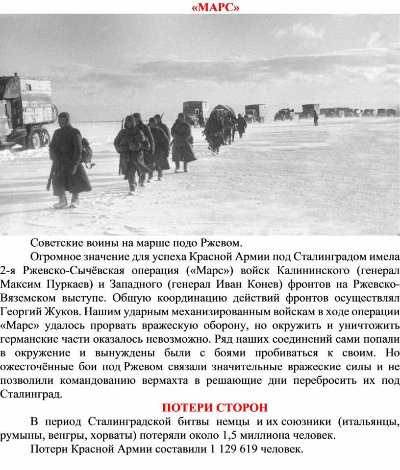 Огромное значение для успеха Красной Армии под Сталинградом имела 2-я Ржевско-Сычёвская операция («Марс») войск Калининского (генерал Максим Пуркаев) и Западного (генерал Иван Конев) фронтов на Ржевско-Вяземском выступе. Общую координацию действий фронтов осуществлял Георгий Жуков. Нашим ударным механизированным войскам в ходе операции «Марс» удалось прорвать вражескую оборону, но окружить и уничтожить германские части оказалось невозможно. Ряд наших соединений сами попали в окружение и вынуждены были с боями пробиваться к своим. Но ожесточённые бои под Ржевом связали значительные вражеские силы и не позволили командованию вермахта в решающие дни перебросить их под Сталинград.