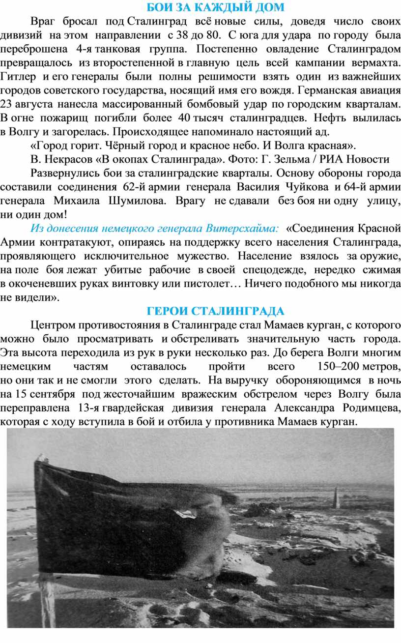Развернулись бои за сталинградские кварталы. Основу обороны города составили соединения 62-й армии генерала Василия Чуйкова и 64-й армии генерала Михаила Шумилова. Врагу не сдавали без боя ни одну улицу, ни один дом!