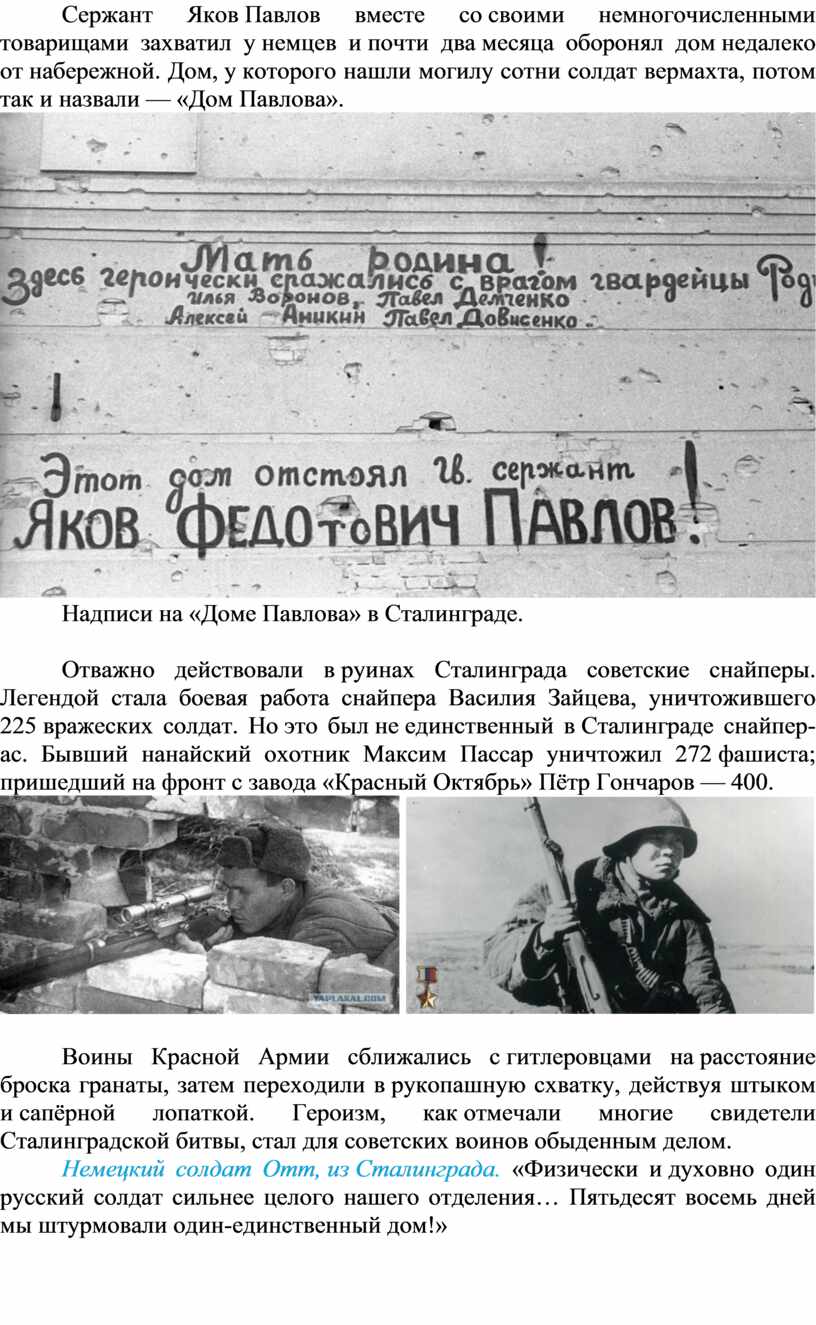 Немецкий солдат Отт, из Сталинграда. «Физически и духовно один русский солдат сильнее целого нашего отделения… Пятьдесят восемь дней мы штурмовали один-единственный дом!»