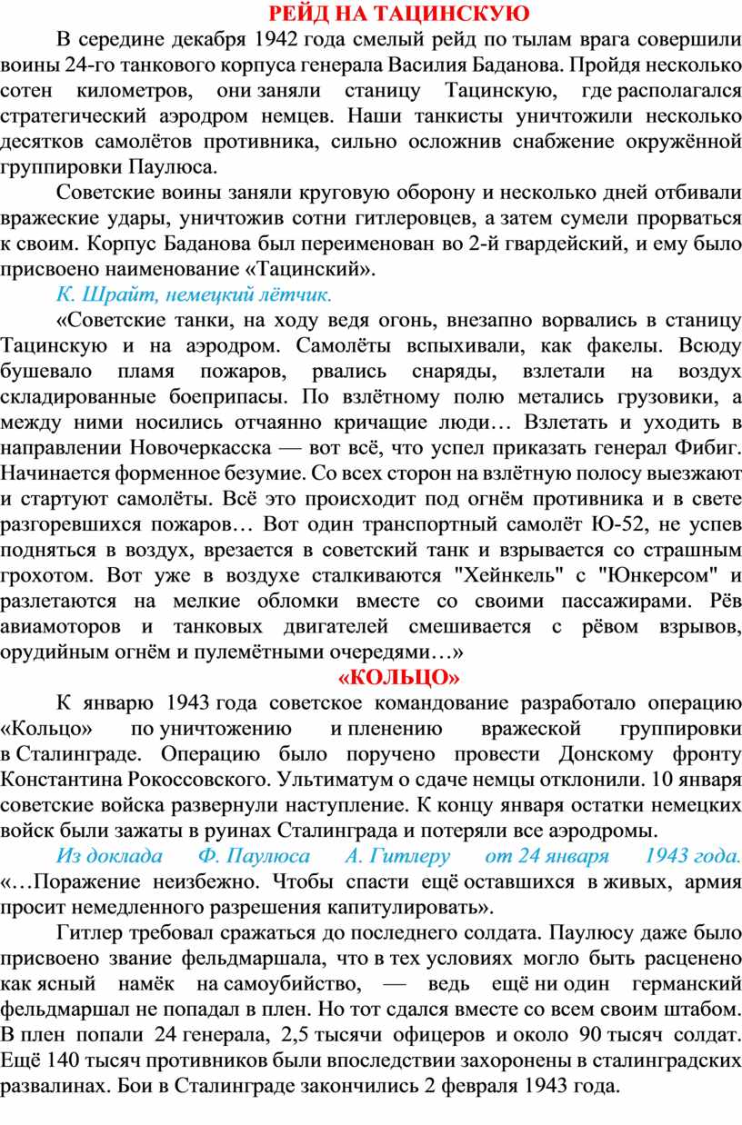 В середине декабря 1942 года смелый рейд по тылам врага совершили воины 24-го танкового корпуса генерала Василия Баданова. Пройдя несколько сотен километров, они заняли станицу Тацинскую, где располагался стратегический аэродром немцев. Наши танкисты уничтожили несколько десятков самолётов противника, сильно осложнив снабжение окружённой группировки Паулюса.