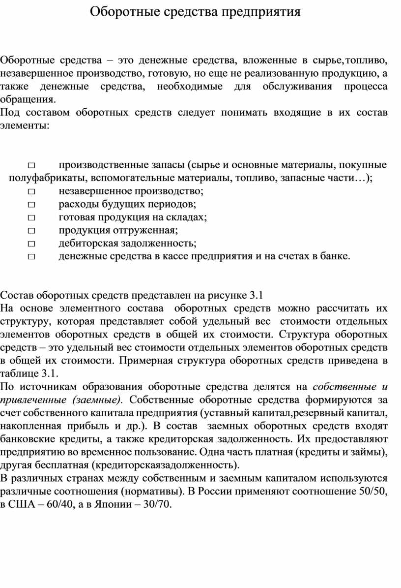 Оборотные средства – это денежные средства, вложенные в сырье, топливо, незавершенное производство, готовую, но еще не реализованную продукцию, а также денежные средства, необходимые для обслуживания процесса обращения.