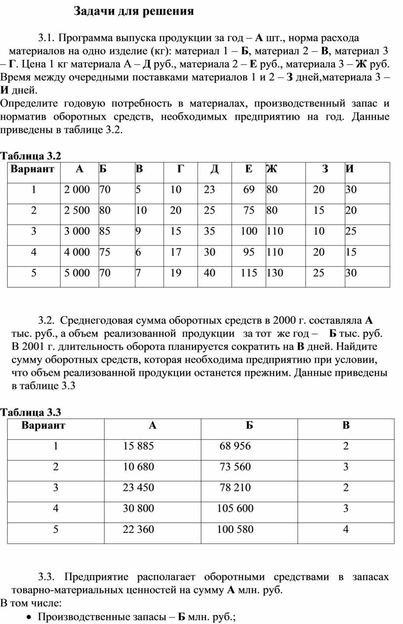 3.2. Среднегодовая сумма оборотных средств в 2000 г. составляла А тыс. руб., а объем реализованной продукции за тот же год – Б тыс. руб. В 2001 г. длительность оборота планируется сократить на В дней. Найдите сумму оборотных средств, которая необходима предприятию при условии, что объем реализованной продукции останется прежним. Данные приведены в таблице 3.3