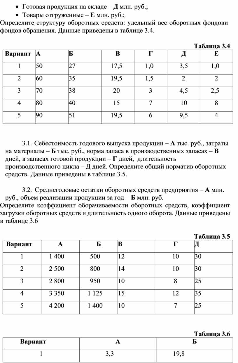3.4. Себестоимость годового выпуска продукции – А тыс. руб., затраты на материалы – Б тыс. руб., норма запаса в производственных запасах – В дней, в запасах готовой продукции – Г дней, длительность производственного цикла – Д дней. Определите общий норматив оборотных средств. Данные приведены в таблице 3.5.