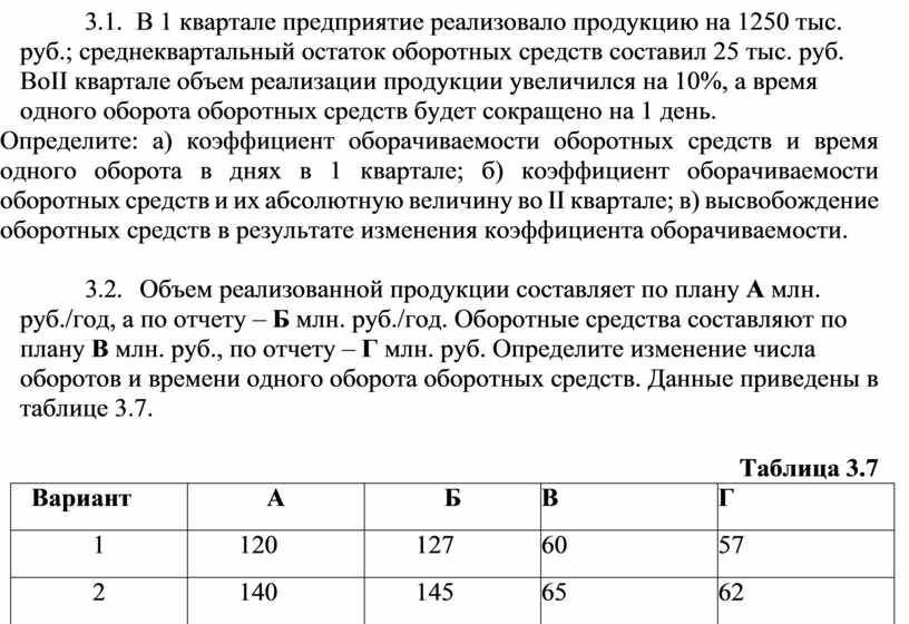 3.7. Объем реализованной продукции составляет по плану А млн. руб./год, а по отчету – Б млн. руб./год. Оборотные средства составляют по плану В млн. руб., по отчету – Г млн. руб. Определите изменение числа оборотов и времени одного оборота оборотных средств. Данные приведены в таблице 3.7.