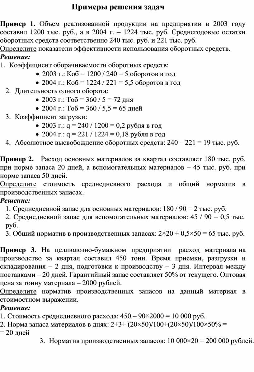 Пример 1. Объем реализованной продукции на предприятии в 2003 году составил 1200 тыс. руб., а в 2004 г. – 1224 тыс. руб. Среднегодовые остатки оборотных средств соответственно 240 тыс. руб. и 221 тыс. руб.