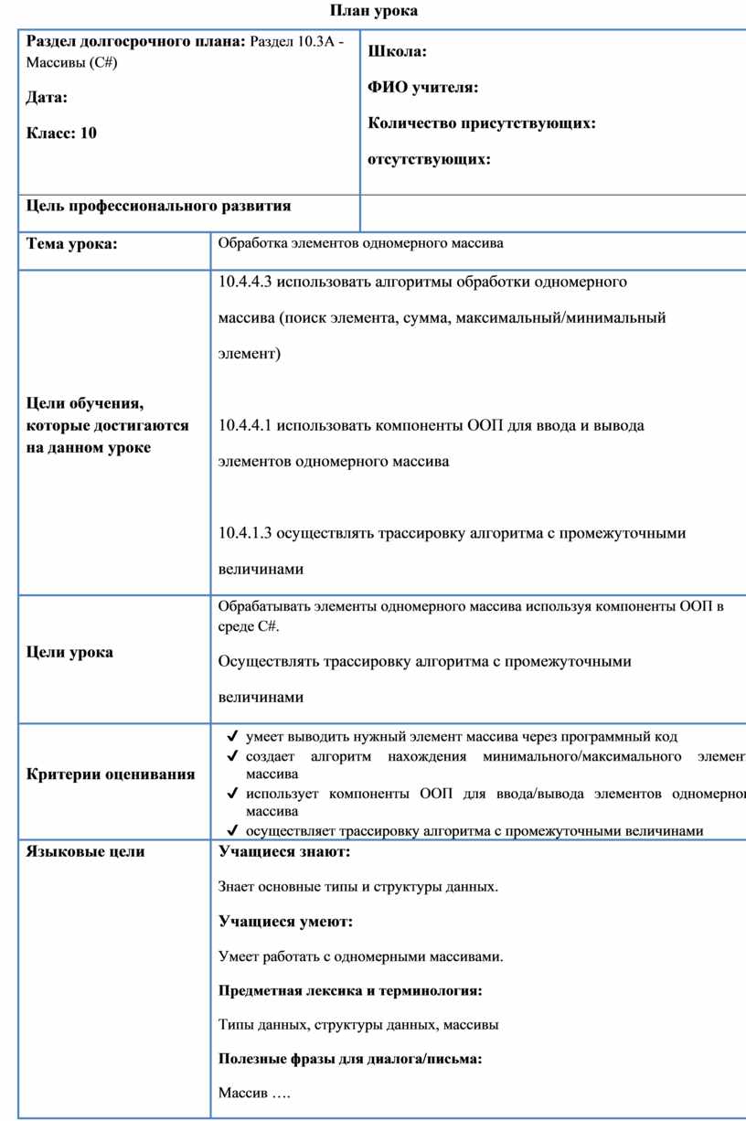 Раздел долгосрочного плана: Раздел 10.3А - Массивы (C#) Дата: Класс: 10