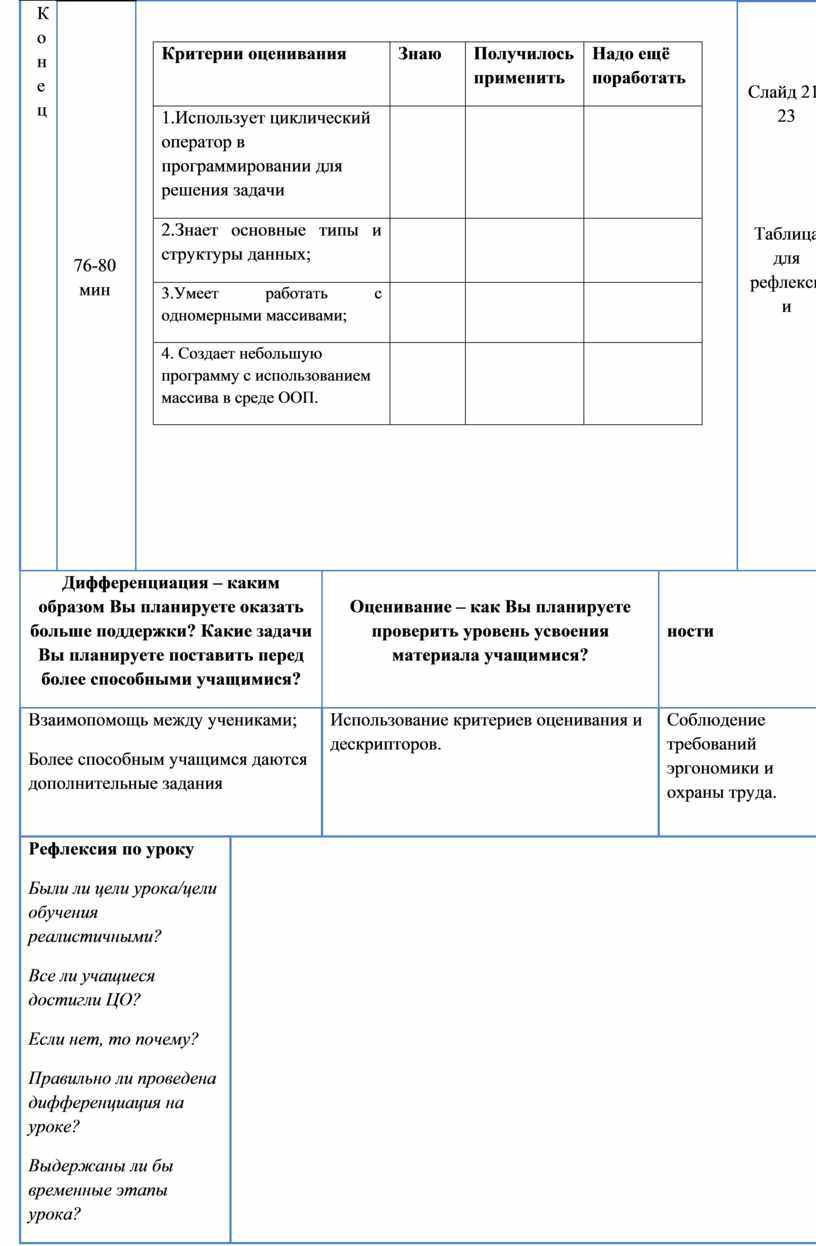 Таблица для рефлексии