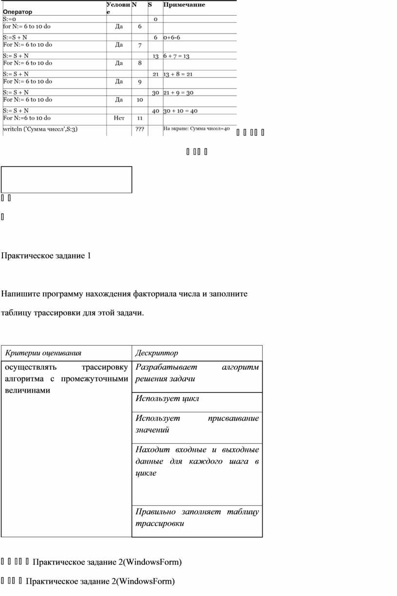 Напишите программу нахождения факториала числа и заполните таблицу трассировки для этой задачи.