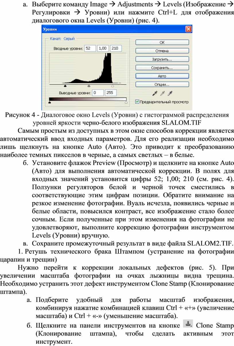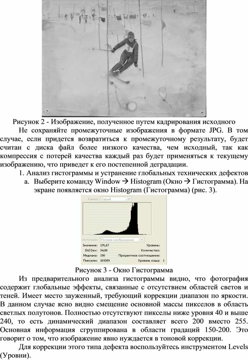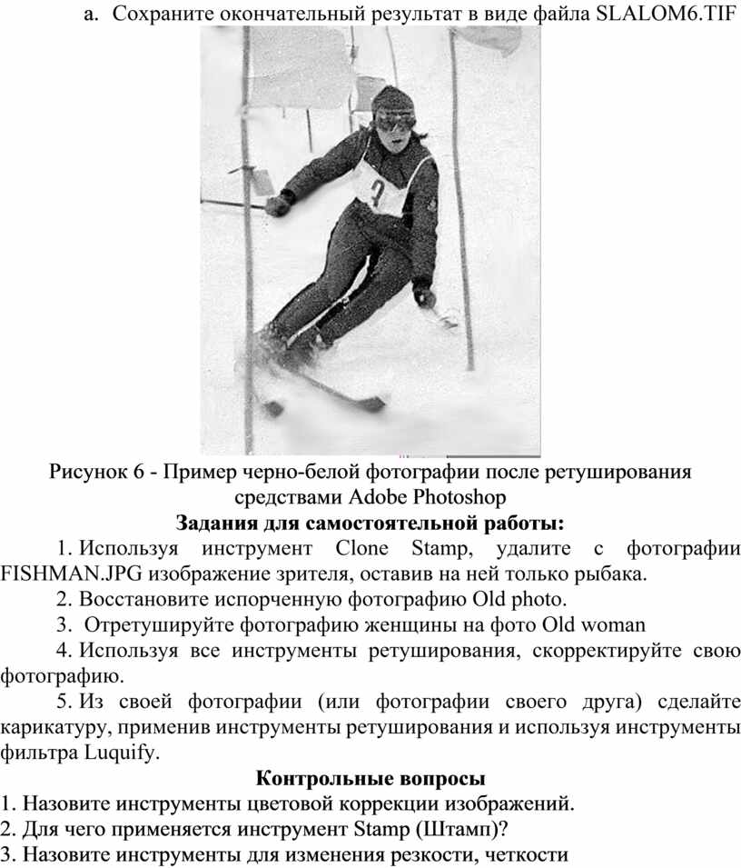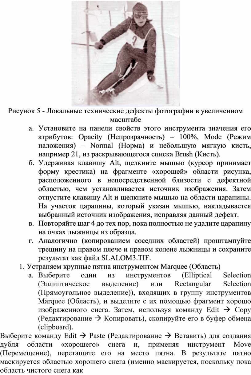 Загрузите файл изображения SLALOM.TIF (или подобную фотографию) в Photoshop и попытайтесь проанализировать имеющиеся в нем дефекты с целью выработки стратегии их поэтапного исправления. В первую очередь, это неудачное кадрирование, пятна, трещины, измятость и другие недостатки.