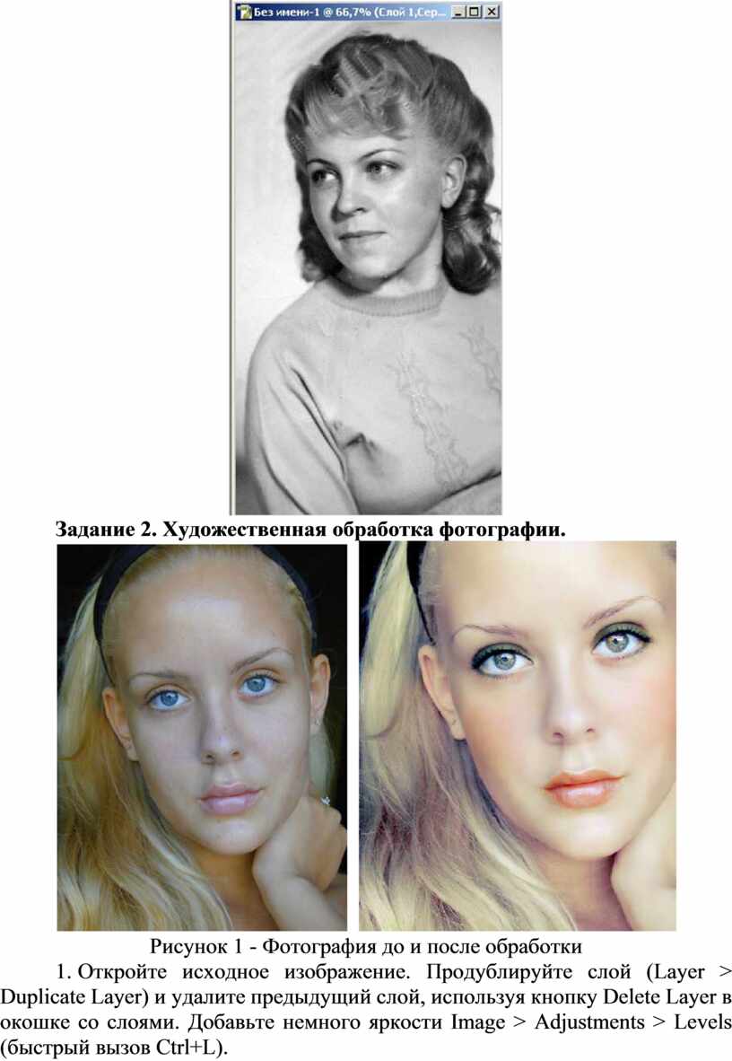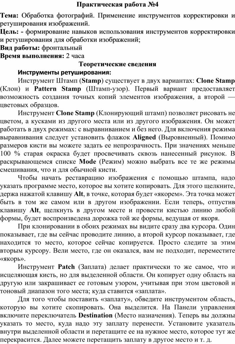 Цель: - формирование навыков использования инструментов корректировки и ретуширования для обработки изображений;